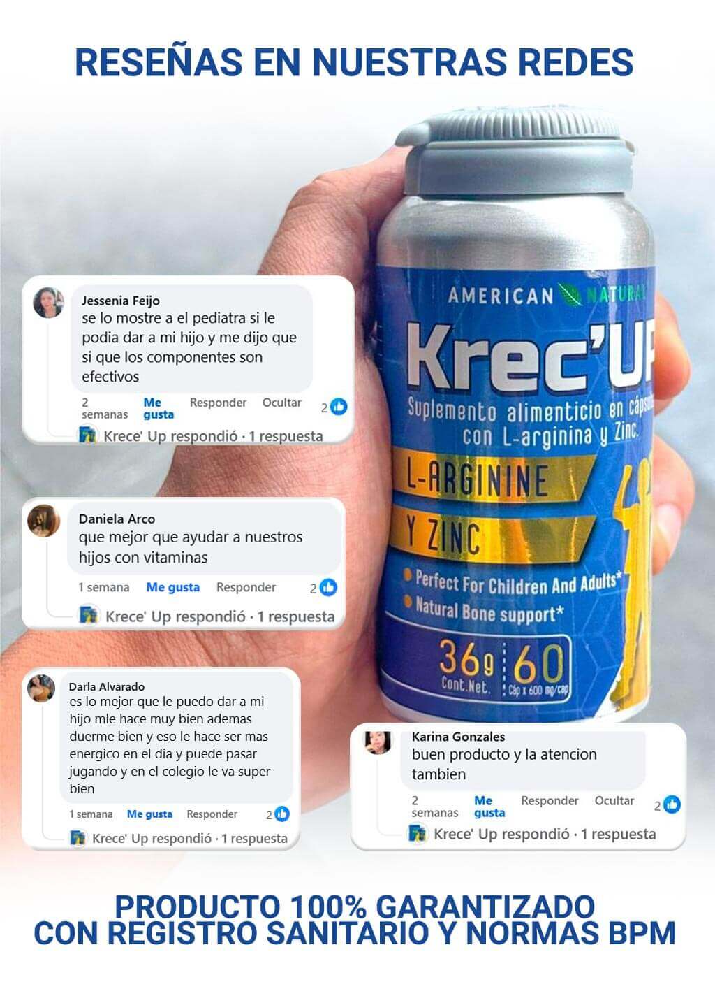 Producto excelente, mi hijo tenía niveles bajos de la hormona de crecimiento y desde que usamos KreceUP junto con su tratamiento médico, el avance ha sido notorio, lo recomiendo si se usa con responsabilidad